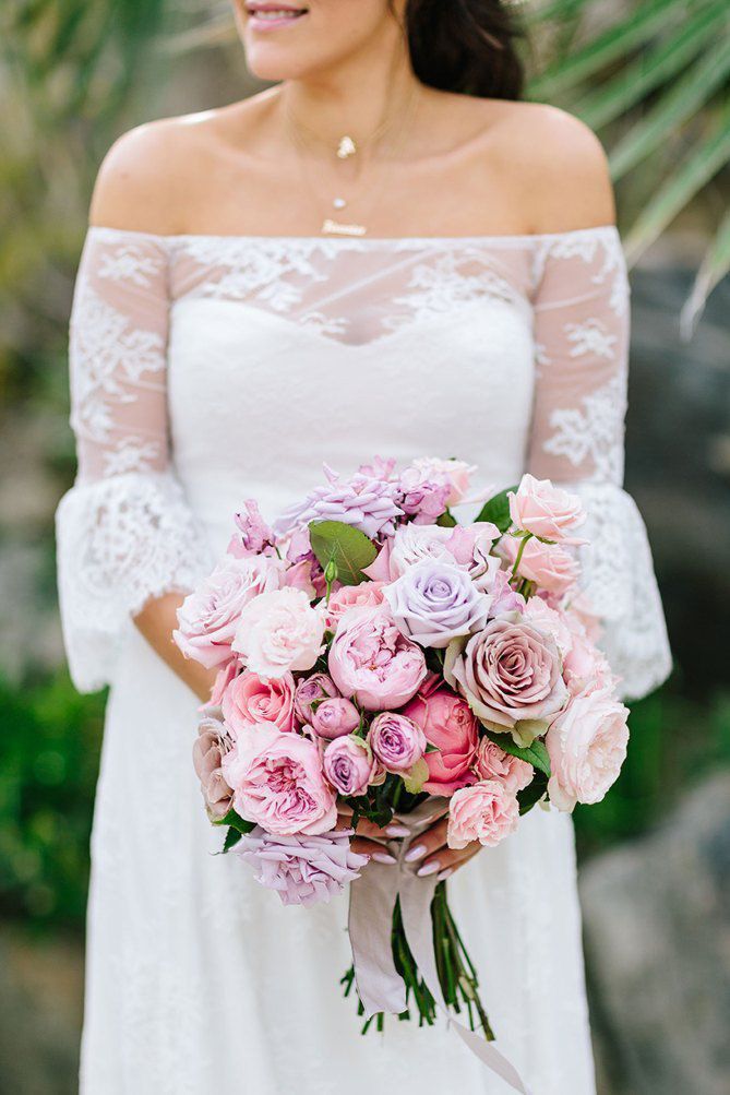 She also loved that the neckline showed off the necklace given to her by her husband-to-be that same day, and layered with her Leenabell necklaces featuring his name and initial. "My 'something old' was the earrings my dad gave my mom at their wedding. Something new was the heart-shaped diamond necklace my husband surprised me with during the first look. A couple weeks ago he said 'I'm gonna get you a heart shaped diamond one day,' and then he pulled it out during our first look, so that day was March 4, 2017! I definitely wasn't expecting it so soon and I can't wait to wear it forever. On a yellow gold chain of course!" she says. "Something borrowed was a beaded clutch my mom lent me me and my something blue was the fairy dust on my nails and my powder-blue Chanel shoes I changed into halfway through the reception ... also my husband's eyes!"
